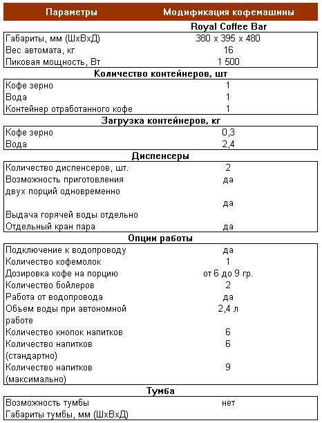 Кофемашина Royal Coffee Bar работает как на натуральном зерновом, так и на молотом кофе. Способна приготовить до 180 порций кофе в час. Процесс приготовления кофе полностью автоматизирован и занимает не более 20 секунд. Не нуждается в очистке после каждой приготовленной порции напитка. Модель оснащена автоматическим капучинатором для приготовления молочной пены для капучино.